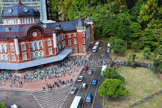 東京駅に行き交う人々の群像が、道路には自動車がストップモーションのように配置されています。